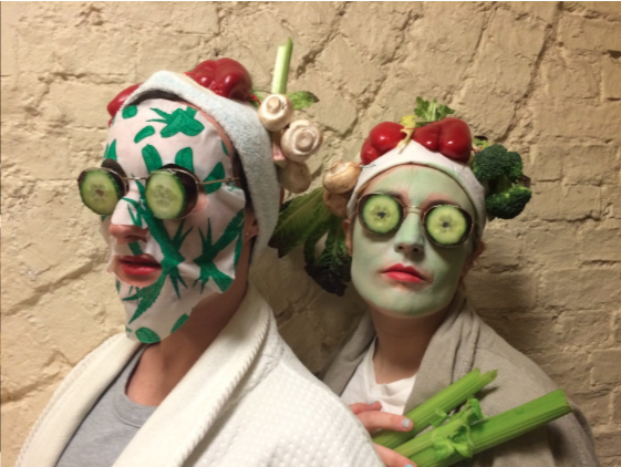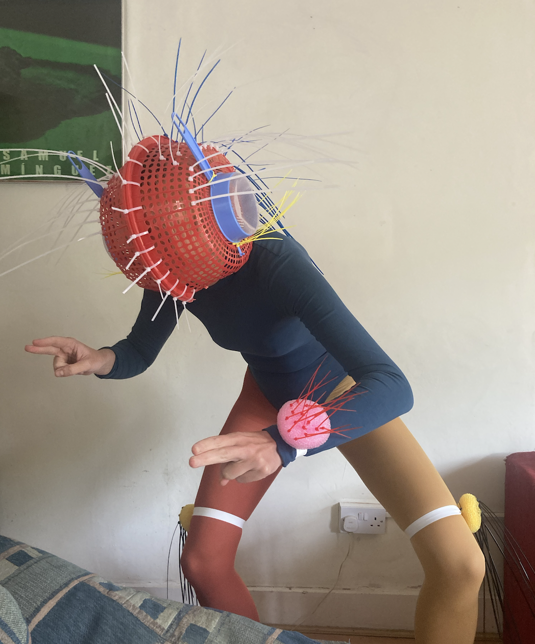Very inspired by this image. Enjoyed using the structure of plastic items found in hardware store, and wandering around Khan’s Bargains and Terry’s looking for the ideal colander. It was surprisingly not so uncomfortable but the fronds were dangerous on a dancefloor.