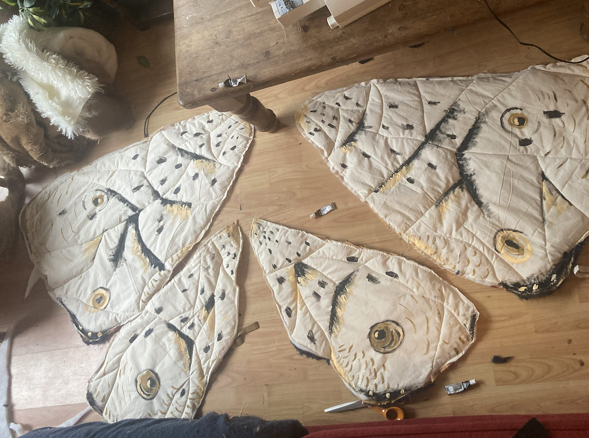This costume was made over 2 evenings and a day, and involved quite a few different processes. The wings were made from three layers of fabric – an orange polycotton outer shell and calico lining, with a layer of foam sandwiched between. I first cut the outer part of the wings and heat pressed spots onto them, then sewed on fur and red webbing to make the pattern. The inner part was painted once I’d quilted the wings together (I think this was the right order).