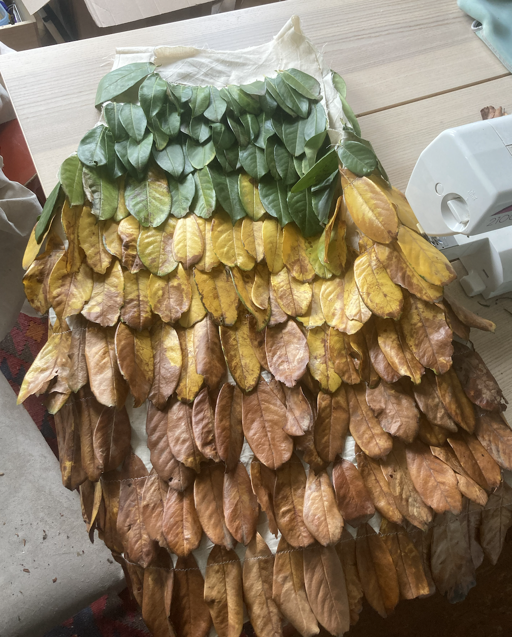 For this I made a simple A-line dress, onto which I stitched laurel leaves from the back garden, using a zig zag stitch so as not to just slice the leaves in half. This worked pretty well, and these held up okay for the first part of the night, but by the end my friends’ house was covered in crunchy leaves that had flaked off the lower layers of the dress.