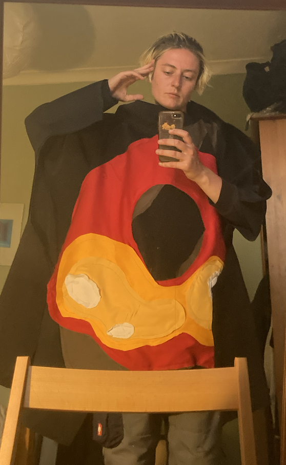 this was not my best work – the idea was to make a kind of Rei Kawakubo style jacket based on the image of the black hole (here for context), using layers of coloured cotton. In the end I was working too large, and the neoprene I selected for the main body was floppy at scale. A woman in the pub where I got changed asked if I was a pizza. sad!