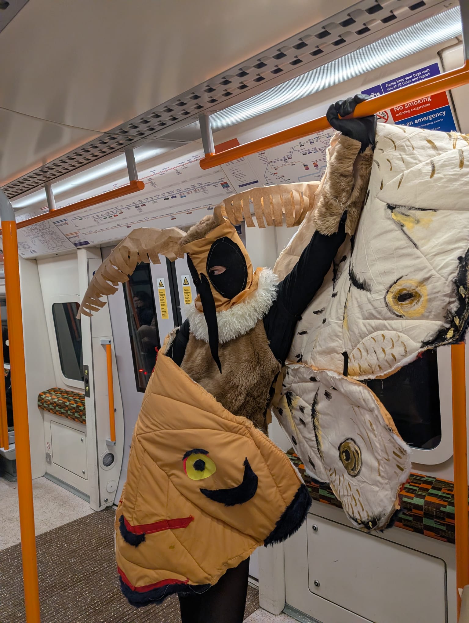 I’d learned a lot about padding from doing the beast, and the quilting worked really well. The antennae were inspired by these instructions. The padded wings came in geninely handy in the storm on our walk home.