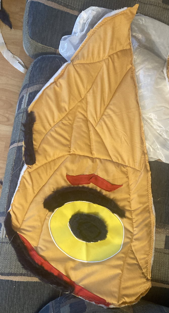 This costume was made over 2 evenings and a day, and involved quite a few different processes. The wings were made from three layers of fabric – an orange polycotton outer shell and calico lining, with a layer of foam sandwiched between. I first cut the outer part of the wings and heat pressed spots onto them, then sewed on fur and red webbing to make the pattern. The inner part was painted once I’d quilted the wings together (I think this was the right order).