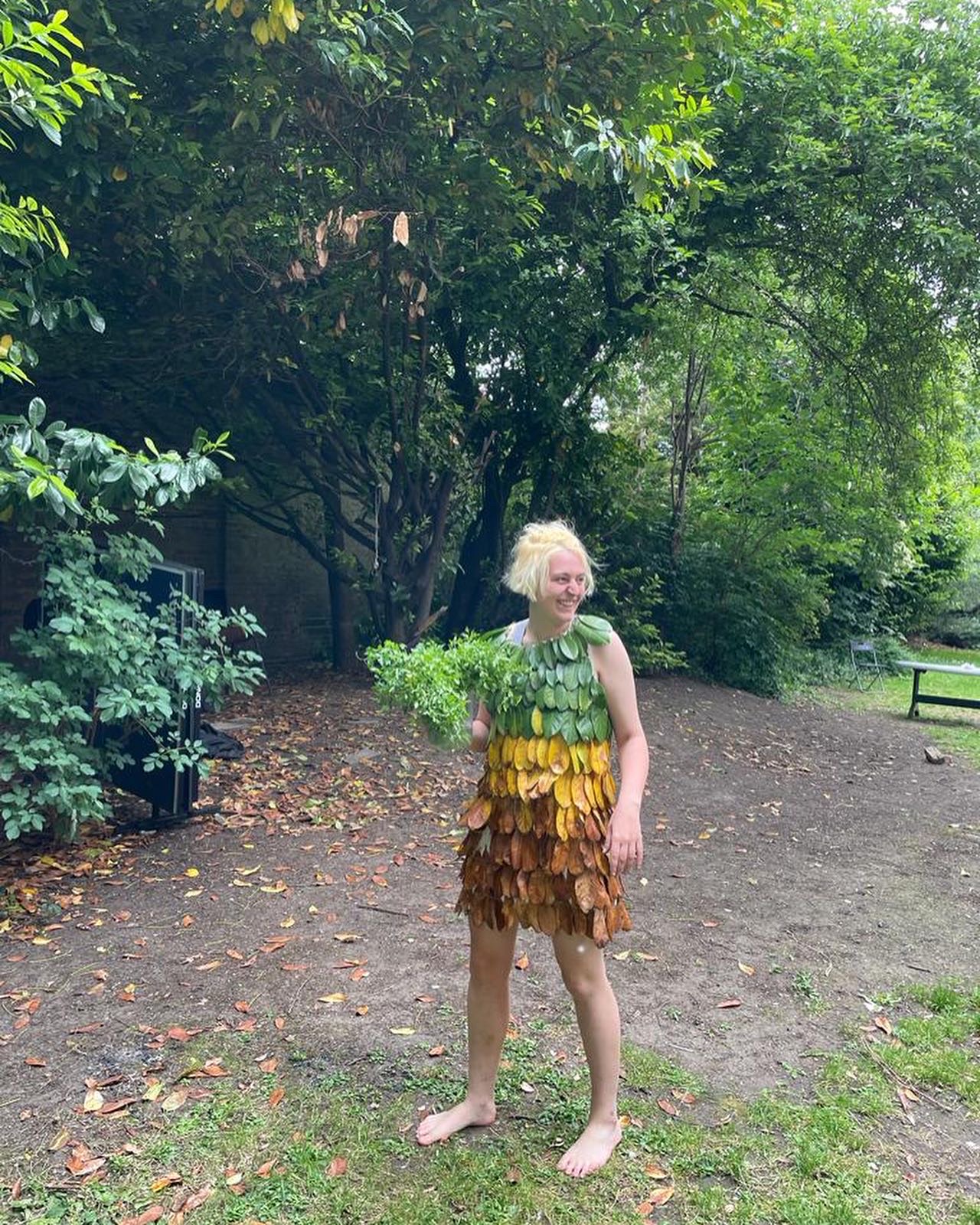 For this I made a simple A-line dress, onto which I stitched laurel leaves from the back garden, using a zig zag stitch so as not to just slice the leaves in half. This worked pretty well, and these held up okay for the first part of the night, but by the end my friends’ house was covered in crunchy leaves that had flaked off the lower layers of the dress.
